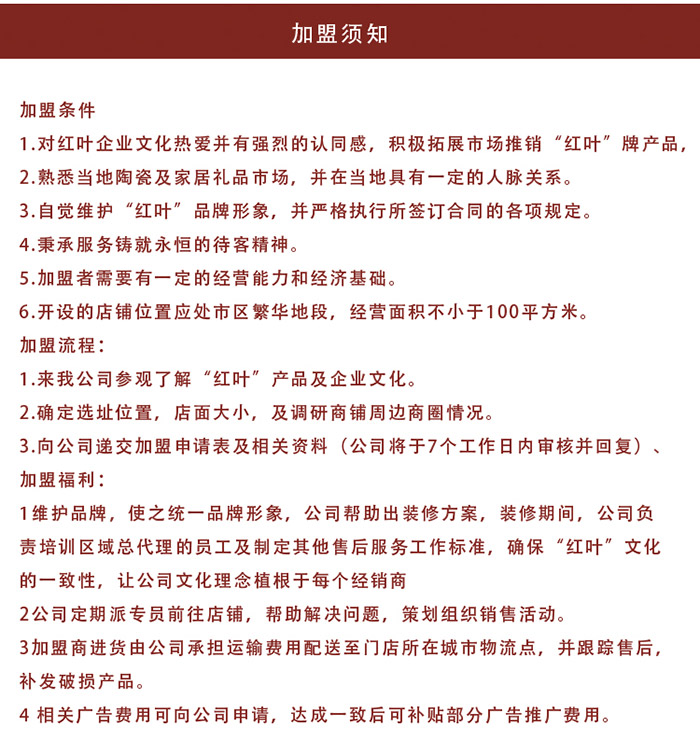良禽擇木而棲,我們熱忱歡迎各界熱愛紅葉陶瓷且備具一定經濟實力的有志之士,加盟“紅葉”,與我們一起共同創造景德鎮紅葉陶瓷股份有限公司的美好明天。