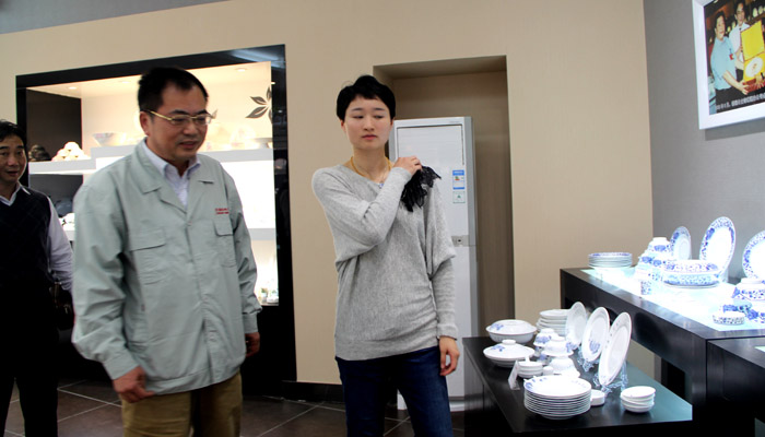 公司董事長王耀在給吳靜鈺介紹中南海二代瓷